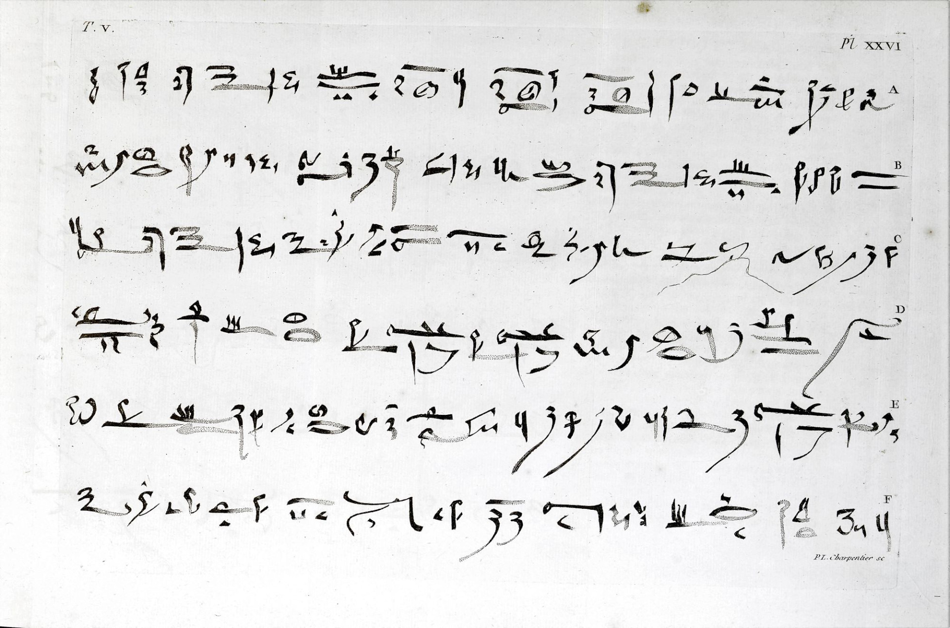 La lámina XXVI (vol. 5) es el grabado de una banda de lino de una momia escrita en hierático. En su descripción Caylus da las medidas y supone que probablemente la tela fue sumergida en algún líquido, probablemente asfalto, para impedir el corrimiento de la tinta de la escritura. Asegura que su reproducción ha procurado ser lo más fiel posible al original, y aporta la información que el Abad Barthélemy le ha proporcionado sobre este tipo de escritura.