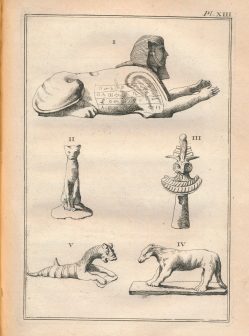 La lámina XIII (vol. 1) que se muestra reproduce una esfinge de bronce (I) y dos estatuillas de gatos (II y III), un ichneumon o rata egipcia (IV) y un animal imaginario (V). La descripción de la esfinge es la más extensa: consigna el material, la posible interpretación de la esfinge (la cabeza de muchacha y el cuerpo de león representarían los signos de Virgo y Leo, a través de los que el Sol pasa en la época de las inundaciones del Nilo), sus medidas, su propietario, el estado de conservación en el que llegó a él y cómo, al ponerlo al fuego, el vapor mató a los pájaros que había en la habitación; le llaman la atención las líneas escritas en sus flancos por estar más espaciadas de lo habitual y por eso las reproduce en la lámina siguiente en tamaño mayor.