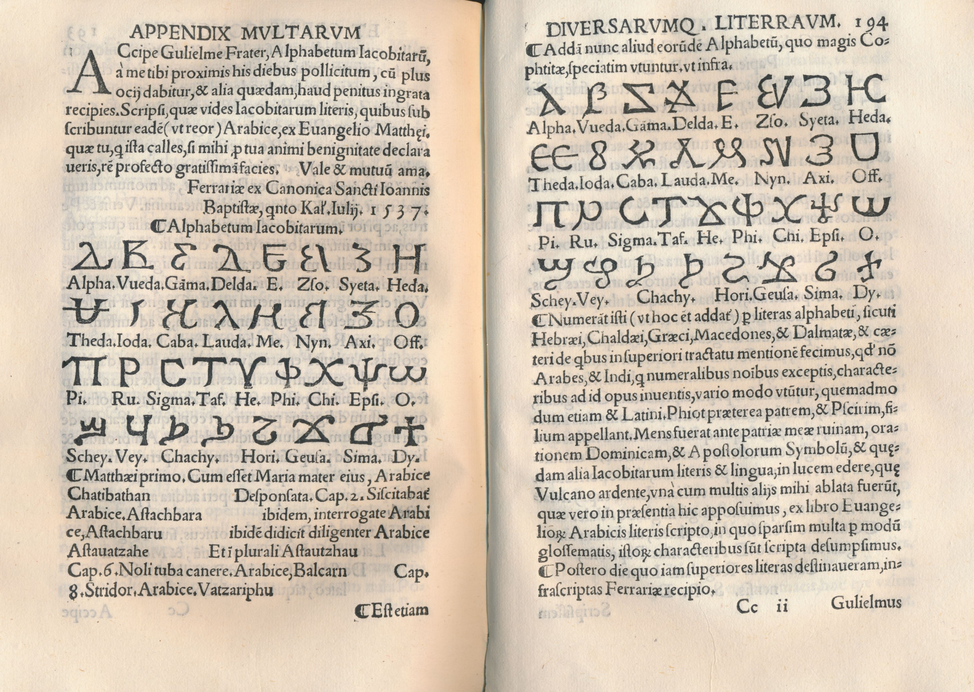 Aunque algunas obras previas incluyeron xilografías del alfabeto copto, esta es la primera que lo acompaña de una descripción algo rigurosa y que correctamente lo atribuye a los coptos de Egipto (pese a nombrarlo también, erróneamente, «jacobita»). Los huecos en la página de la izquierda estaban destinados a ser rellenados manualmente con las palabras en copto ya que no se habían fabricado todavía tipos móviles para este alfabeto.