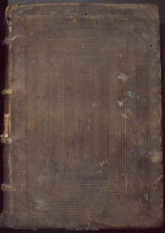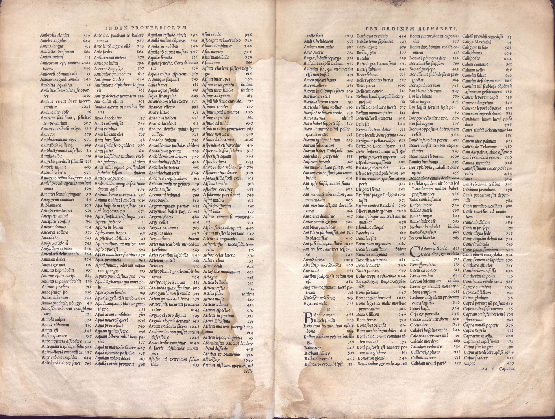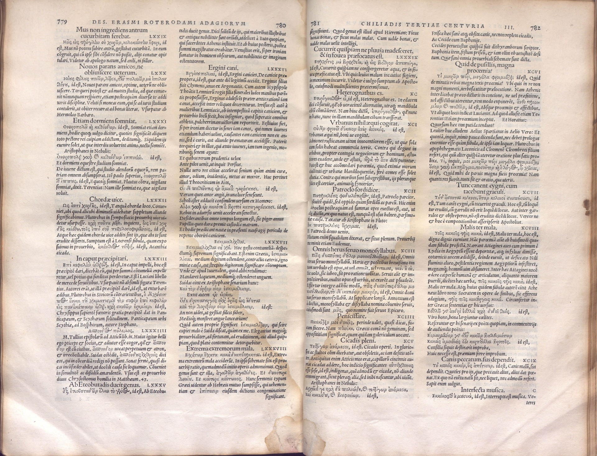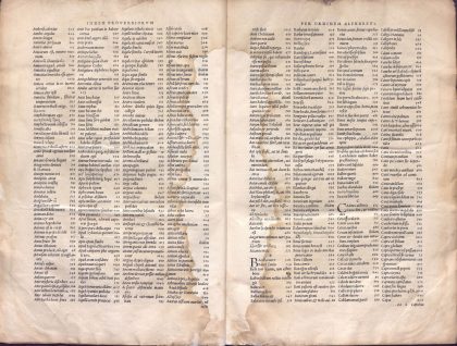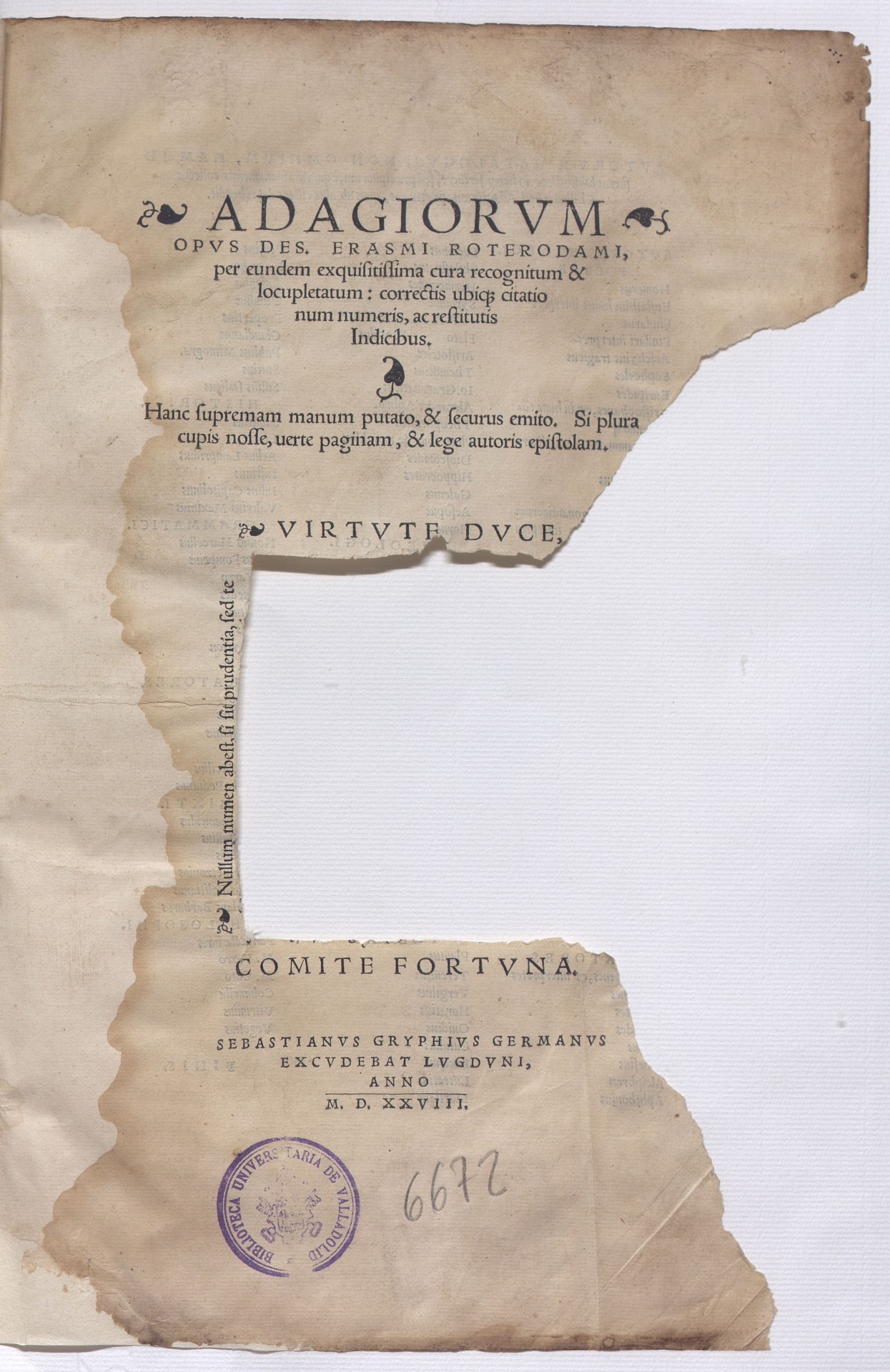 En este otro ejemplar del Adagiorum de Erasmo la portada principal ha sido mutilada intencionadamente. Se observan tres cortes alrededor de la imagen central y dos desgarros que van desde esa zona hacia el corte delantero, por tanto ha desaparecido la imagen y también el papel que se hallaba entre los dos desgarros.