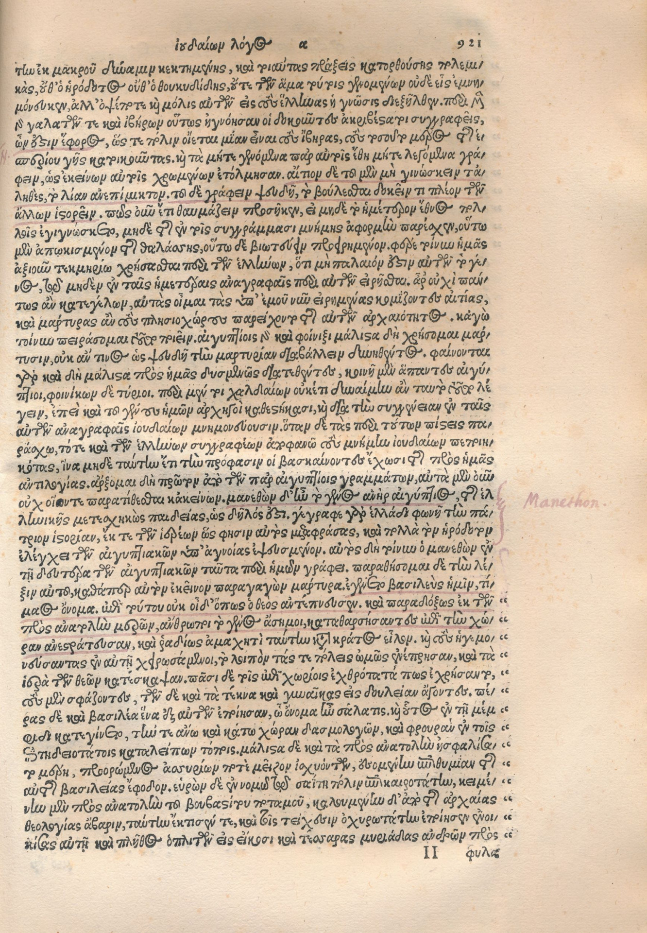 Flavio Josefo fue un autor judío que residió en Roma y allí escribió toda su obra en griego. En su «Contra Apión», una obra de polémica sobre los orígenes y la antigüedad de los judíos, transmite algunos de los pasajes más completos de Manetón. Esta es la primera edición impresa de las obras de Josefo en griego, al cuidado de Arndt van Eyndhouts (Arnoldus Arlenius, ca. 1510-1582).