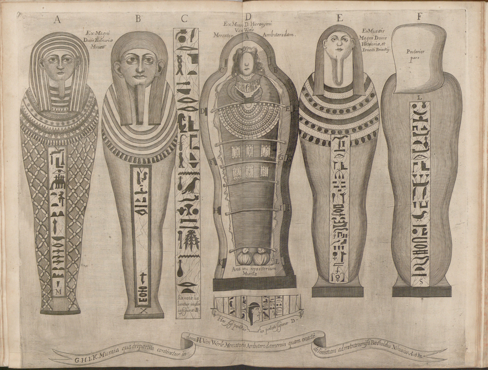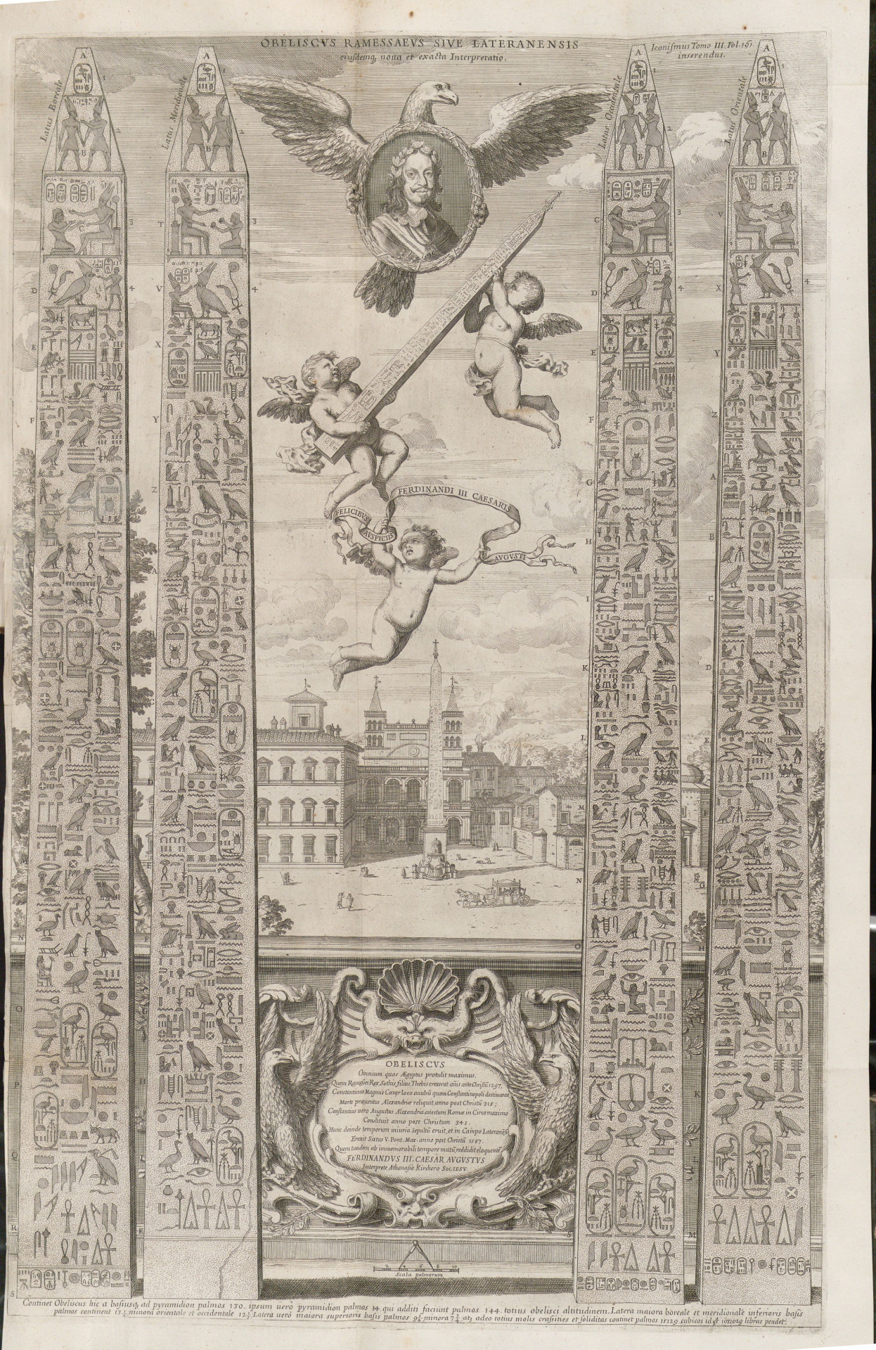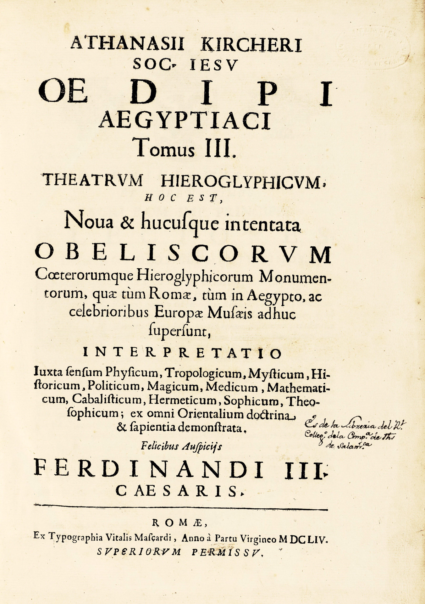 Tras sus otros tratados (Prodromus coptus y Lingua Aegyptiaca restituta), la actividad de Kircher sobre el Egipto antiguo se vio aplazada hasta que el papa Inocencio X le encargó el estudio y restauración del llamado obelisco panfilio, en la Piazza Navona, lo que dio pie a su primera obra estrictamente dedicada a los jeroglíficos (1650). Dos años después vio la luz el primer libro de los tres que conforman su Oedipus Aegyptiacus, en el que plasma de manera más completa su visión de la escritura jeroglífica egipcia. Para él, los textos jeroglíficos serían complejas elaboraciones iconográficas en las que se reflejarían las ideas teológicas y metafísicas de los egipcios, ideas que en su mayor parte compartía el propio Kircher. Su interpretación está cargada de concepciones neoplatónicas y jamás pensó que los jeroglíficos pudieran usarse para algo no fuera un saber elevado y esotérico, lo que resultó un claro error.