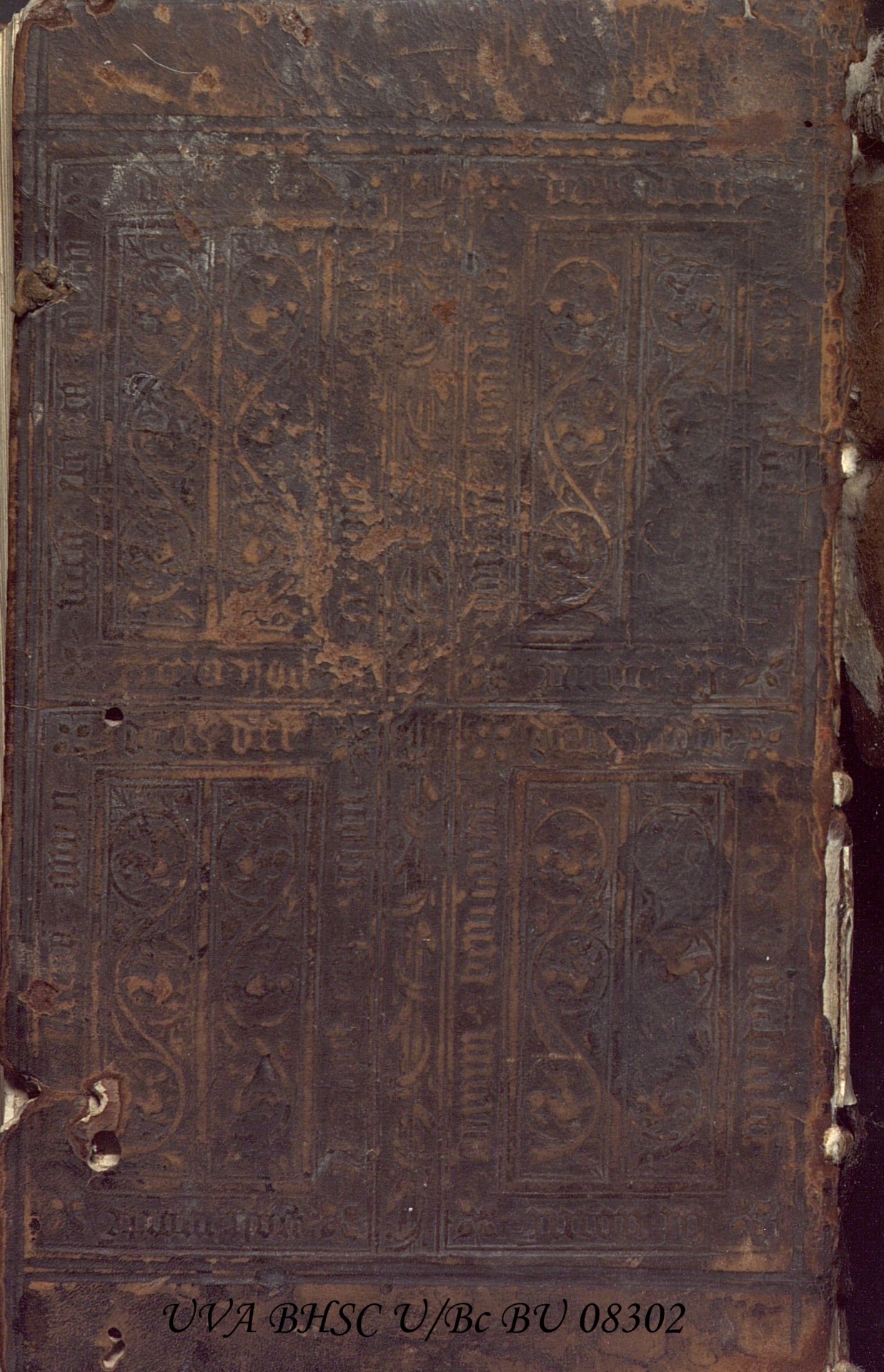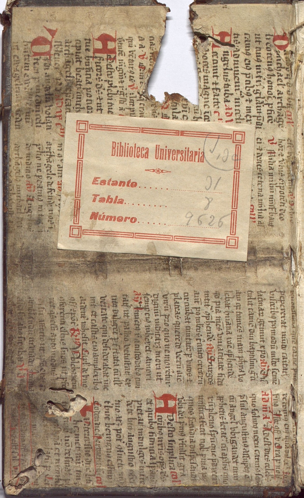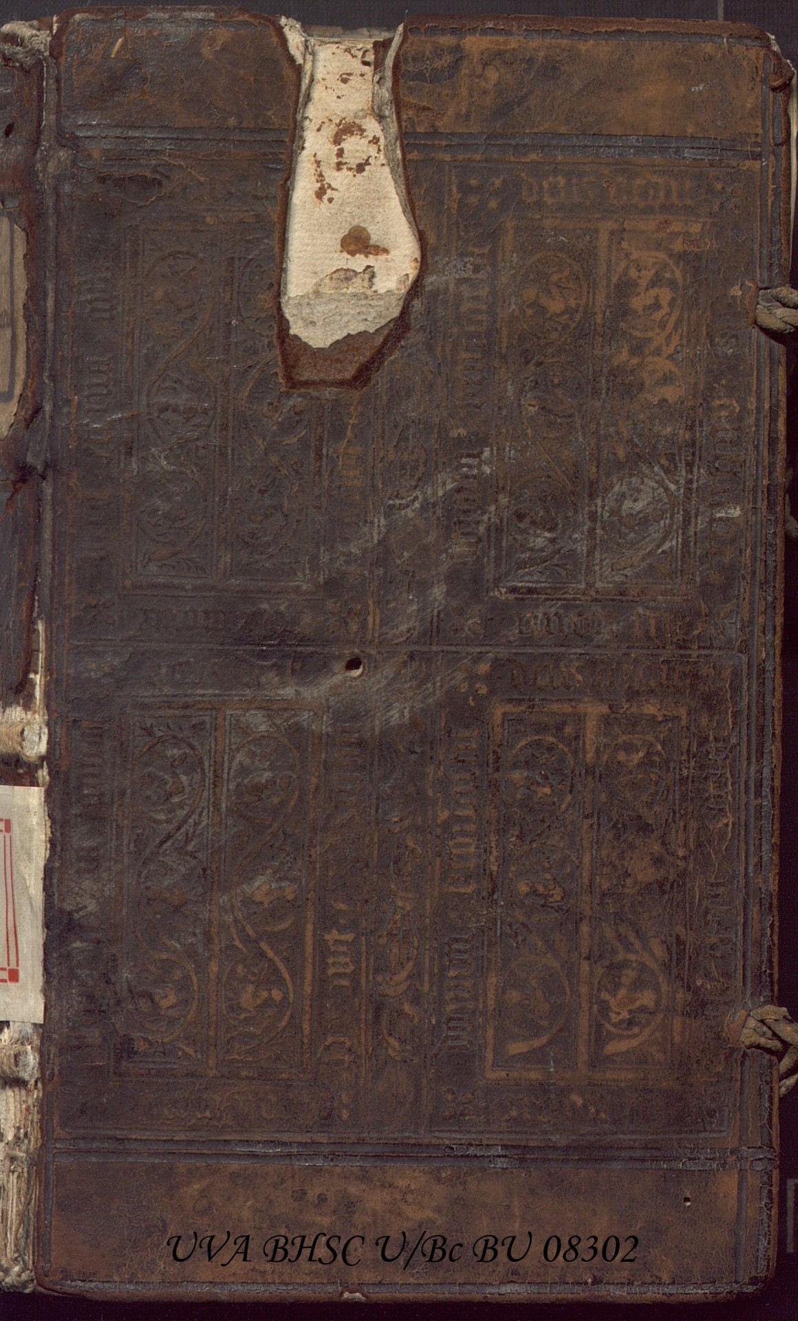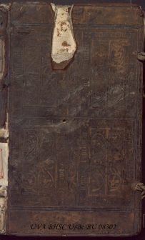 Durante la Edad Media, muchas bibliotecas albergaban libros encadenados (libri catenati) a atriles y bancos para que solo pudieran ser consultados, nunca tomados en préstamo o sustraídos por los amigos de lo ajeno. En este caso observamos una encuadernación de la que se han “recortado” los restos del anclaje de una cadena, probablemente para poder encajar mejor el libro en la estantería. Se observan restos de óxido de la antigua cadena en la primera hoja de guarda. En otros ejemplares la cadena y sus enganches se han retirado de forma más cuidadosa y los únicos restos visibles son pequeños orificios en las cubiertas (como se aprecia en la contracubierta).
