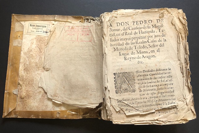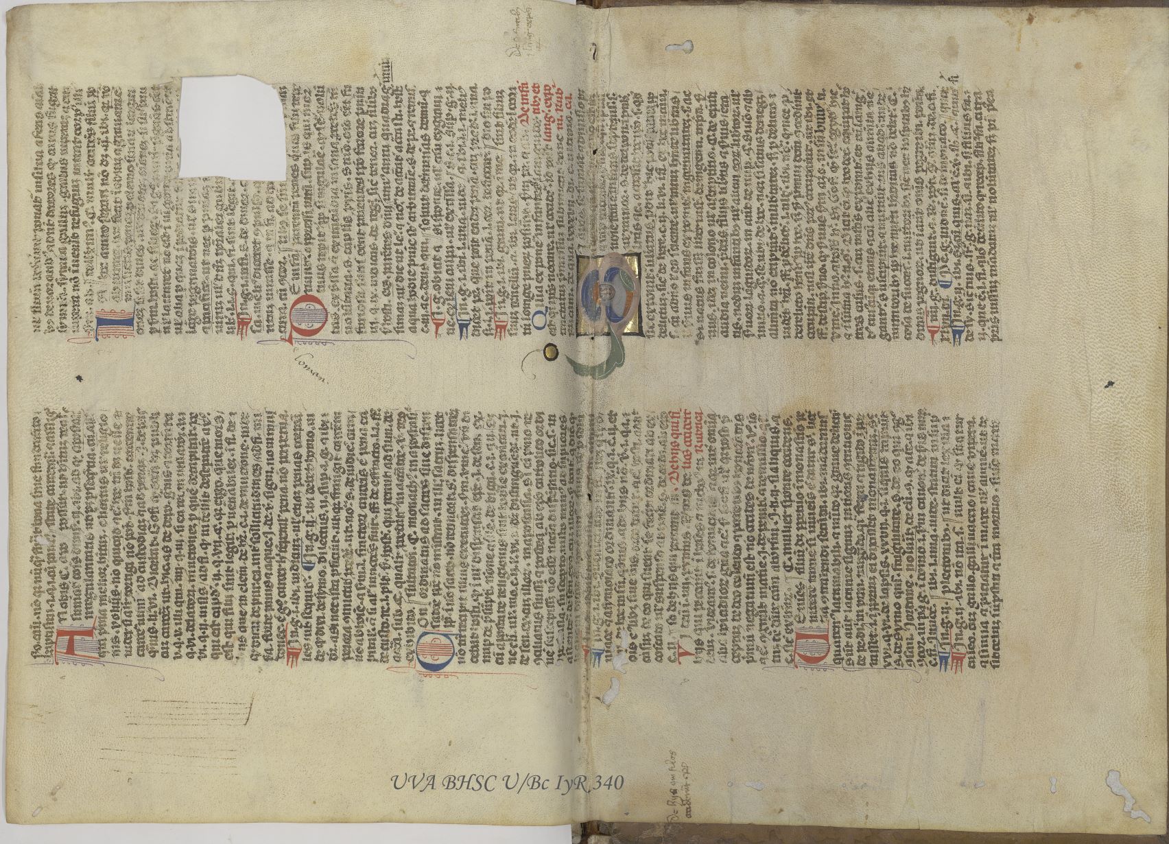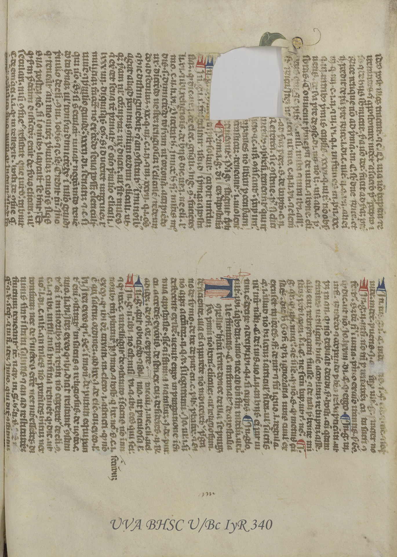 En este caso, la mutilación se perpetró sobre las hojas de guarda, que pertenecen a algún manuscrito reutilizado para la encuadernación de este incunable.