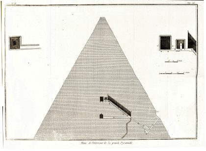 La página que se expone es un dibujo del interior de la Gran Pirámide, que procede de las memorias de Benoît de Maillet (cónsul en Egipto entre 1692 y 1708) –al que esta vez sí cita–; de hecho, reproduce ¡treinta páginas! de su descripción de las pirámides de Gizah. De Maillet las había visitado más de cuarenta veces y las medidas y proporciones del dibujo son bastante precisas, aunque aún no se conocía el corredor descendente por debajo de su unión con el corredor ascendente.