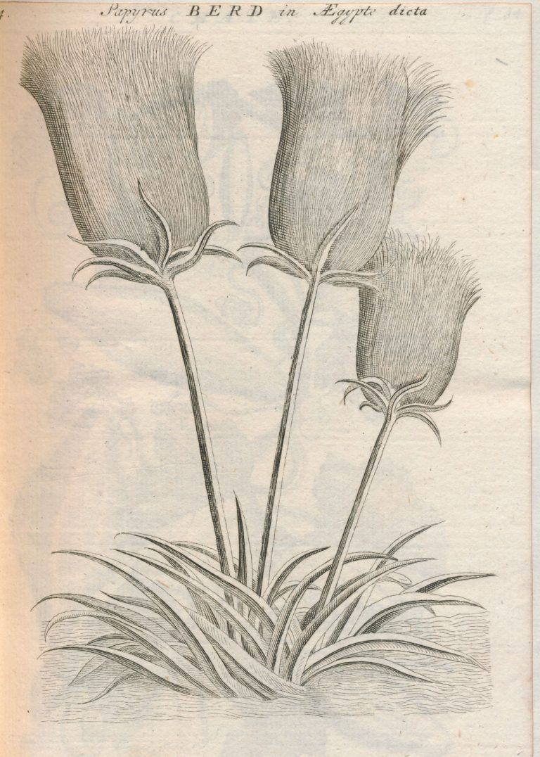 En el reino vegetal destaca una planta que ha sido trascendental en la trasmisión de la cultura antigua, el papiro, con el que se confeccionaban los rollos o volúmenes. En su traducción y comentario al tratado sobre las propiedades medicinales de las plantas de Dioscórides (siglo I e.c.) el médico español Andrés Laguna recoge tanto su valor terapéutico como su antigua función: “El papiro es una planta que, a manera de junco, nace en los pantanos de Egipto y en ciertas lagunas de Siria, gruesa como el brazo de un hombre y de diez codos luenga, cuyo tallo es triangular, del cual antiguamente se hacía el papel…” (1, 86).