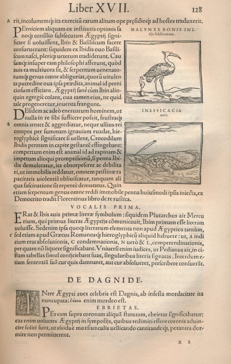 Más alejado de la observación directa y más cercano a la mitología y al simbolismo es el tratamiento del ibis sagrado (Threskiornis aethiopicus), de cuya importancia da cuenta el hecho de que con él se representa al dios Thot y está atestiguada también por la gran cantidad de aves momificadas que se han encontrado. Las ideas que ya encontramos en los antiguos se recuperan en el Renacimiento, cuando se quiere proponer una interpretación de los jeroglíficos y entonces se destaca su poder bienhechor, pues el ibis libra a los egipcios de las serpientes aladas que vuelan desde Arabia en primavera.